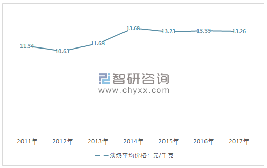 总的来看,淡奶属于乳制品的初加工产品,乳制品人均消费量与人均收入、宏观经济运行情况存在一定关联,人均乳制品消费量是衡量一个国家人民生活水平的主要指标之一。随着城镇化的进程、城镇居民生活水平的不断提高,淡奶的消费需求量呈明显上升趋势,同时随着居民收入的不断上升,对淡奶产品要求逐渐上升,行业产品结构升级趋势明显,近几年,我国淡奶行业价格整体呈现上涨态势,从2011年的11.34元/千克增长到2017年的13.26元/千克,如下图所示: