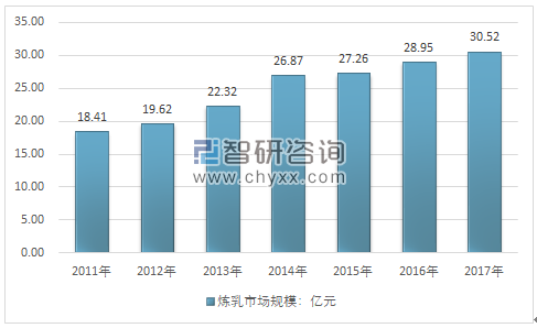 2017年我国炼乳行业市场规模30.52亿元,同比2016年的28.95亿元增长了5.42%。