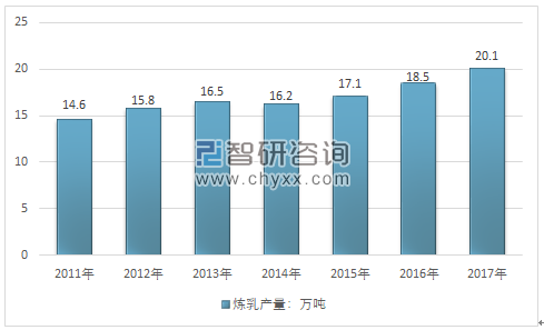 智研咨询发布的《2019-2025年中国炼乳行业市场专项调研及投资战略研究报告》显示目前,乳制品制造(炼乳)行业竞争激烈,市场化程度高。行业内存在基地型乳品企业与城市型乳品企业长期共存、全国性品牌和区域性品牌共同发展的局面。国外大型食品企业在我国投资建厂的外资乳品企业由于缺少奶源的支持并受到消费渠道的影响,在2000年后纷纷退出了中国市场。从2005年开始,雀巢、荷兰皇家菲仕兰公司等境外公司纷纷进入国内乳制品制造行业,这无疑加剧了乳制品市场的竞争。同时,国内大型乳品企业也将在与外资企业的竞争和合作中提升自身的技术管理水平,借助外资开拓国际市场,实现品牌国际化。近年来,国内炼乳行业产量稳步增长,从2011年的14.6万吨增长到2017年的20.1万吨。