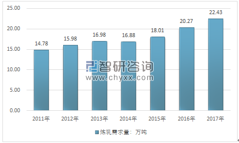 2017年我国炼乳行业消费量22.43万吨,同比2016年的20.27万吨增长了10.66%。炼乳的下游主要是烘焙、食品加工、餐饮行业和家庭消费。通过下游加工,以糕点、甜品、饼干、奶茶、咖啡、酸奶等产品形式最终到达消 费者或者直接面向终端消费者销售。