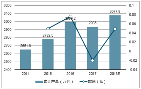 据数据显示,2018年4月,全国乳制品产量216.2万吨,同比增长7%;2018年1-4月全国乳制品产量841.6万吨,同比增长8.2%。预计2018年我国乳制品产量将达到3077.9万吨,未来五年年均复合增长率约为5.65%。