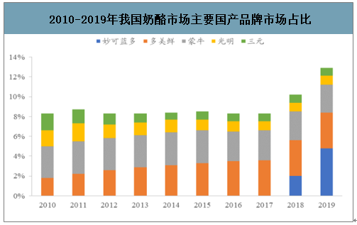2010-2019年我国奶酪市场主要国产品牌市场占比