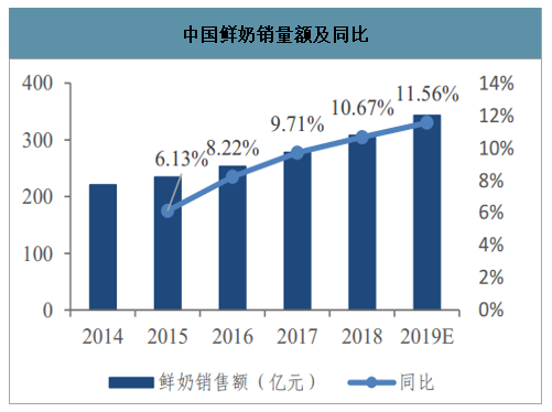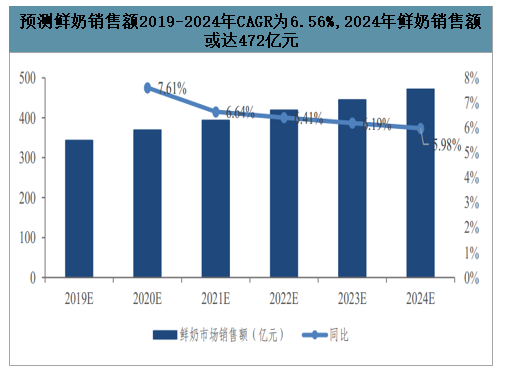 预测鲜奶销售额2019-2024年CAGR为6.56%,2024年鲜奶销售额或达472亿元