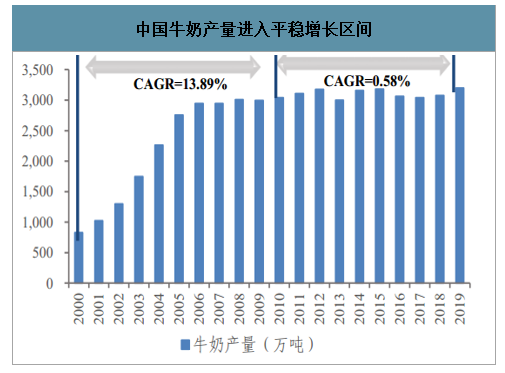 中国牛奶产量和乳制品销量均经历过高速发展阶段,现走入缓速增长阶段。中国牛奶产量经历过高速发展阶段,在2000-2010年间牛奶产量CAGR达13.89%,但2010-2019年牛奶产量CAGR仅为0.58%,复合增长率趋于平缓。其中,2019年牛奶产量为3201万吨,同比增长4.11%。中国乳制品销量经历双位数增长阶段后,进入到波动阶段,17、18年乳制品销量同比增长分别为-2.36%和-7.70%,2019年虽扭负为正,但同比增长仅为1.09%。综合来看,乳制品销量进入平稳阶段,关键在于突破中创新,寻找新的结构增长点。