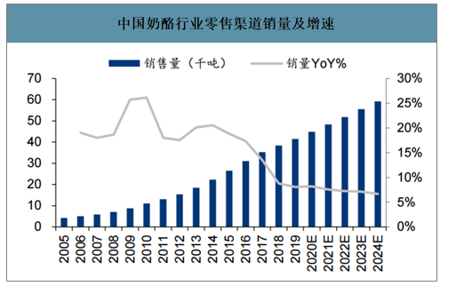 智研咨询发布的《2020-2026年中国奶酪行业市场需求前景及竞争策略研究报告》数据显示:2019年我国零售奶酪终端市场规模约65.5亿元,2010-2019年复合增速达到22%,预计2024将达到112亿元,预计2020-2024年年均复合增速12%。2019年我国零售奶酪终端销量4.15万吨,2010-2019年复合增速达到17%,预计2024将达到5.92万吨,预计2020-2024年年均复合增速7%,销售额增速高于销量增速,即表明在销量快速增长的同时保持价格的同步提升。