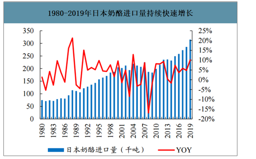 1980-2019年日本奶酪进口量持续快速增长
