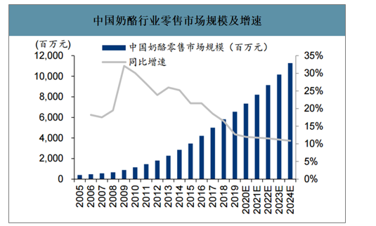 中国奶酪行业零售市场规模及增速