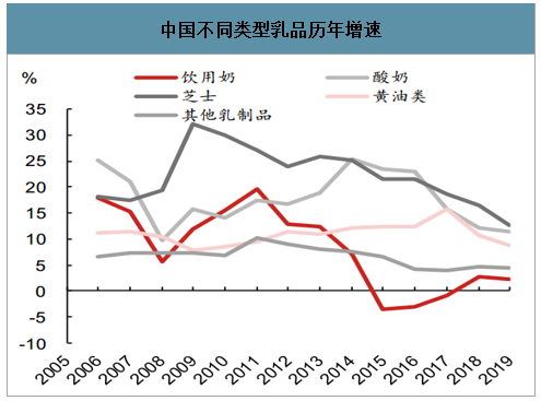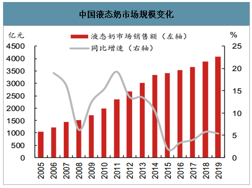 中国乳品市场在2007年之前发展迅速,销售额增速维持在16%以上。2008年因食品安全“三聚氰胺”事件爆发,增速急剧滑落至6.3%。之后增速反弹,2009年-2014年间销售额年均复合增速(CAGR)达14.1%。2015年起中国乳品行业消费市场低迷,奶价下探,行业低单个位数增速期,近5年CAGR为4.3%。其中,2018年起增速略有回升(至5%以上),2019年中国乳品销售规模达4196亿元。