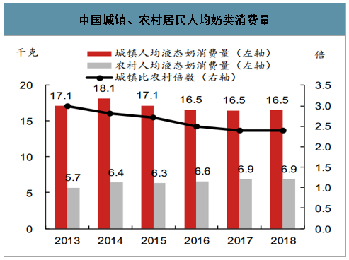 智研咨询发布的《2020-2026年中国乳品产业运营现状及发展前景分析报告》数据显示:根据中国的原奶产量和净进口量,把各类奶制品还原成原奶口径后,我们推算中国2018和2019年原奶人均年消费量约分别为33.2千克、35.1千克。2018年日本原奶人均消费量为95.7千克,约是中国的2.9倍,表明中国原奶人均消费量还有较大提升空间。