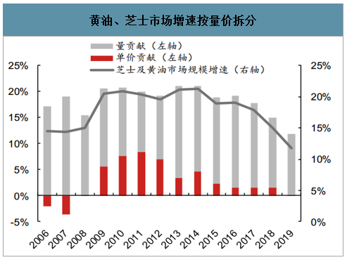 2015年以来,液态奶市场保持低单位数增长,销售单价贡献超过消费量贡献份额。鉴于中国液态奶消费与全球可比国家(饮食习惯相近)差距较小,长期而言中国人均液态奶消费量与收入增长间的弹性关系将减弱,我们认为未来平均售价将成为液态奶行业收入增长的关键驱动因素,而平均售价我们认为主要受产品高端化驱动。对于其他干乳品类如黄油、芝士等,我们认为还处在主要靠消费量推动行业增长的阶段。