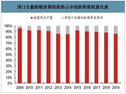 进口全脂奶粉折算的原奶占中国原奶消耗量比重