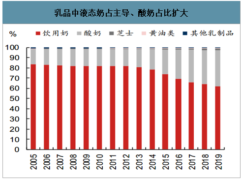 在乳品销售中,液态奶1(饮用奶及酸奶)仍占主导地位,2019年销售额4087亿,但近年来小部分市场被干乳品(芝士、黄油等)蚕食。2005年中国液态奶、干乳品销售额占比分别为98.2%和1.8%,2019年则变为97.4%和2.6%。液态奶中的饮用奶消费占比最大,2019年占液态奶比重达63.5%;但酸奶销售额占比也在持续攀升,占液态奶比重从2005年的14.7%提升至2019年的36.5%。