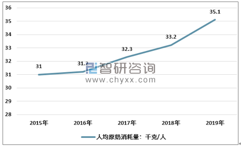 2015-2019年中国人均原奶消耗量
