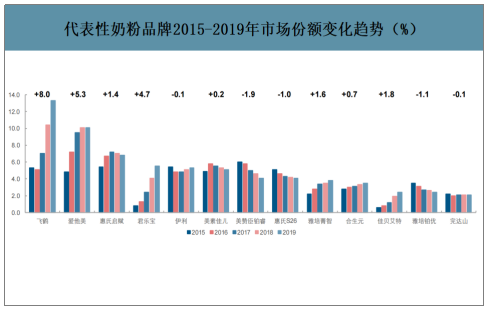 代表性奶粉品牌2015-2019年市场份额变化趋势(%)