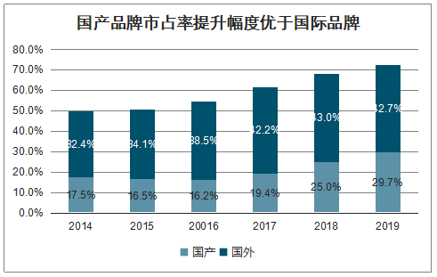 国产品牌逐步崛起,国际品牌势微。相较于国际品牌,国产品牌从价格定位、渠道下沉力度、营销推广方式等方面更适合低线市场,更加受益于中小品牌的出清。2015-2019年奶粉行业排名前20的品牌中,国际品牌和国产品牌市场份额分别提升了8.6及13.2pct,国产品牌提升幅度更大;其中,以飞鹤和君乐宝提升幅度尤为明显,国际品牌除达能旗下爱他美提升明显外,其余品牌市场份额多小幅提升甚至出现下滑。