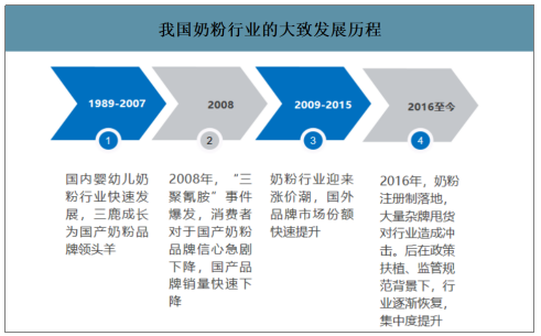我国婴幼儿奶粉的发展历程,2008年是我国奶粉行业发展的分水岭。2008年之前,国内婴幼儿奶粉行业保持快速发展,国产品牌占据60%的市场份额,其中伊利、圣元等品牌稳稳占据了中高端市场,三鹿、完达山等品牌则固守中低端市场,而国际品牌主要定位于高端市场。但伴随着2008年三聚氰胺事件的爆发,国产奶粉龙头三鹿破产,消费者对国产奶粉的信心急剧下降,国产品牌销量快速下滑。出于安全性考虑,从2009年开始,奶粉行业迎来涨价潮,高端定位的国际品牌市场份额快速提升。2016年,奶粉注册制落地,大量大牌甩货对行业造成明显冲击,后在政策扶植、监管规范引导下,行业逐渐恢复;同时,中小品牌的出清也逐渐带来行业集中度提升,国产品牌基于品牌信誉重建、借力渠道变革等措施,开始逐渐崛起。