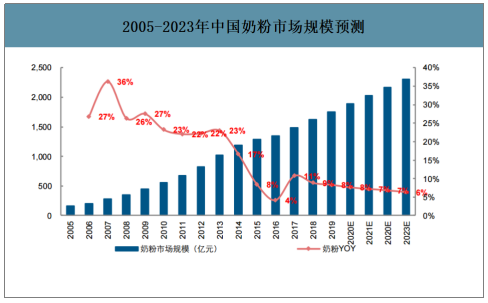 智研咨询发布的《2020-2026年中国婴幼儿奶粉行业市场竞争状况及市场供需预测报告》数据显示:全球婴幼儿配方奶粉的市场规模将从2018年的591亿美元增长到2026年的950亿美元,年复合增长率6%。2019年我国奶粉行业市场规模为1755亿元,同比增长8.4%,过去5年复合增速为8%。预测2020-2023年奶粉行业复合增速为7%。