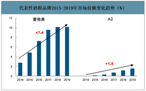 在奶粉注册制推动的行业出清背景下,国产品牌市场份额提升速度显著更快,而国际品牌多持平甚至下滑;而在国际品牌中,达能旗下爱他美品牌和新西兰奶粉品牌A2市场份额则表现出显著提升,2014-2019年爱他美、A2品牌市场份额分别由2.7%、0%提升至10.1%、1.5%,且均表现出“电商渠道渗透率较高”以及“线上渠道竞争优势明显”的特征。