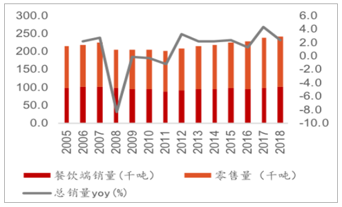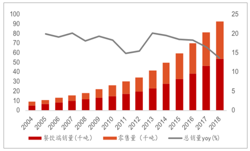行业规模接近100亿,有望步入快速发展通道。2018年奶酪市场规模终端口径100亿,其中零售端约58亿,餐饮端约42亿。自2004年以来,复合增速达18%,未来趋势向好。