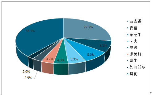 需求长期依赖进口,外资品牌占据主要市场。2018年奶酪进口量为10.83万吨,进口额达35亿元,而国内产量约只有3万吨,需求的增长依赖于进口满足。当前国内有奶酪生产许可证的厂商约45家,其中有实际产量的只有不到20家,且大多数为进口原制或再制奶酪进行再加工,也有代理外资品牌如蒙牛代理爱氏晨曦。行业龙头基本是外资品牌,主要有百吉福、安佳、乐芝牛等,内资品牌市占率较低,主要有三元、妙可蓝多、蒙牛、伊利等。