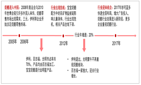 奶酪发展史回顾:安全事件导致12年行业危机,17年后行业消费氛围转好,更多企业加入市场教育。中国奶酪行业主要经历了三个节点:进入——2005~2006年;危机——2012年;机会——2017年。随着人均收入增长,消费者对高生活水平的追求,消费结构升级,乳制品行业整体得到迅猛发展,奶酪行业的消费者教育阶段正在逐步加速。