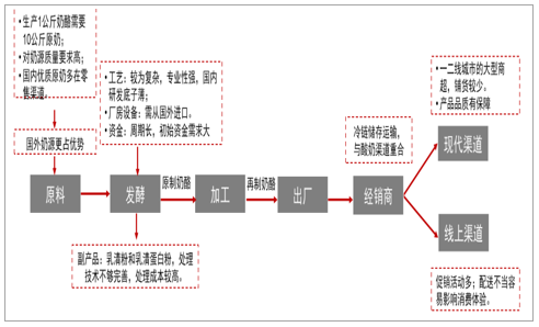 配方相对难复制,但不存在绝对壁垒。原制奶酪生产主要通过在全脂奶中添加菌种将乳糖转化为乳酸,加入凝乳酶使酪蛋白凝结沉淀,再经过加盐干燥等多道程序,温度湿度等变量差异将最终影响奶酪品类,如切达就有很多种。所以光看配料表不能调出一样的口感,仿制有难度,口感差异会很大。但行业本质在生产端不存在绝对壁垒,更多看投入的资本精力。