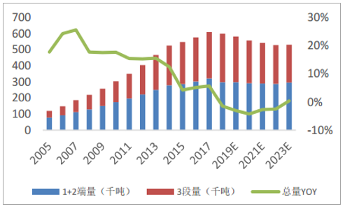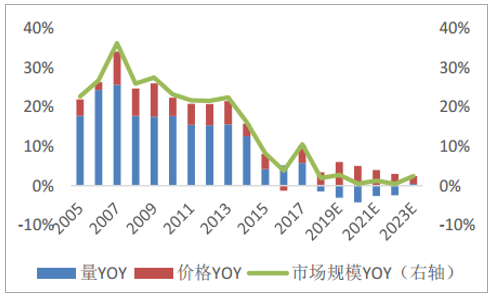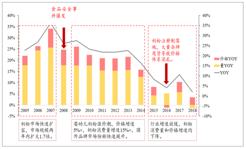 人均消费量增加推动奶粉行业快速增长。2005~2014年奶粉市场快速扩张,CAGR为24.50%,其中奶粉销量CAGR为18.50%,奶粉的价格基本保持每年5%的稳定上涨,可见“量增”是奶粉市场扩张的主要原因。2015年以来,奶粉消费量增长的放缓,当前终端零售规模约为1500亿,折算至出厂口径约为1000亿。