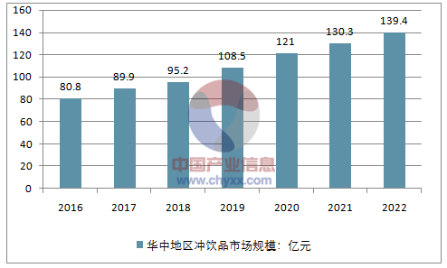 到2022年华中地区冲饮品市场规模将增长到139.4亿元。