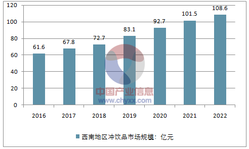 到2022年西南地区冲饮品市场规模将增长到108.6亿元。