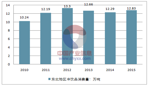 2014年东北地区冲饮品消费量为12.29万吨,2015年消费量约为12.83万吨。