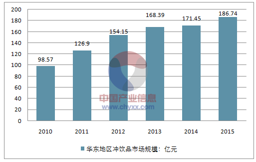 2014年华东地区冲饮品市场规模为171.45亿元,2015年市场规模约为186.74亿元。