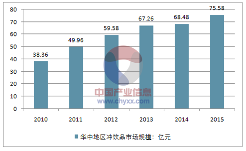 2014年华中地区冲饮品市场规模为68.48亿元,2015年市场规模约为75.58亿元。