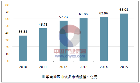 2014年华南地区冲饮品市场规模为62.96亿元,2015年市场规模约为68.03亿元。