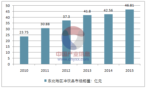 2014年东北地区冲饮品市场规模为42.56亿元,2015年市场规模约为46.81亿元。