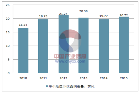 2014年华中地区冲饮品消费量为19.77万吨,2015年消费量约为20.72万吨。
