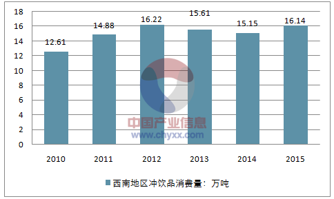 2014年西南地区冲饮品消费量为15.15万吨,2015年消费量约为16.14万吨。