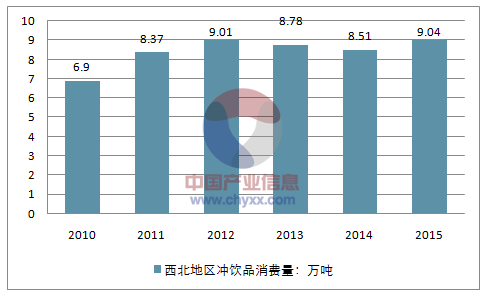 2014年西北地区冲饮品消费量为8.51万吨,2015年消费量约为9.04万吨。