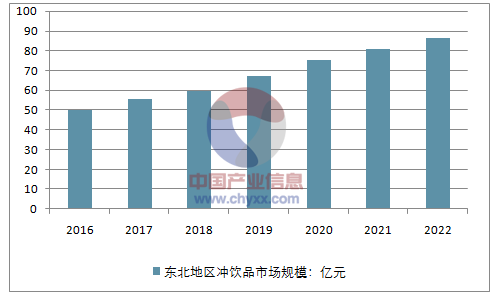 到2022年东北地区冲饮品市场规模将增长到86.4亿元。