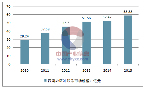 2014年西南地区冲饮品市场规模为52.47亿元,2015年市场规模约为58.88亿元。