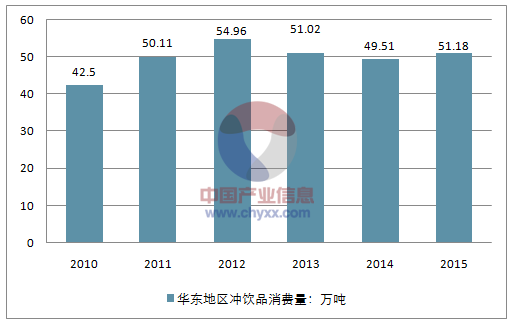 2014年华东地区冲饮品消费量为49.51万吨,2015年消费量约为51.18万吨。