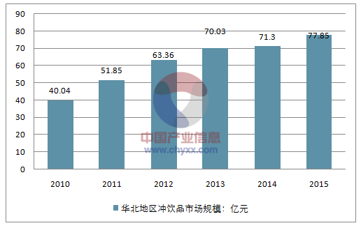 2014年华北地区冲饮品市场规模为71.3亿元,2015年市场规模约为77.85亿元。