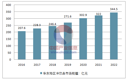 到2022年华东地区冲饮品市场规模将增长到344.5亿元。