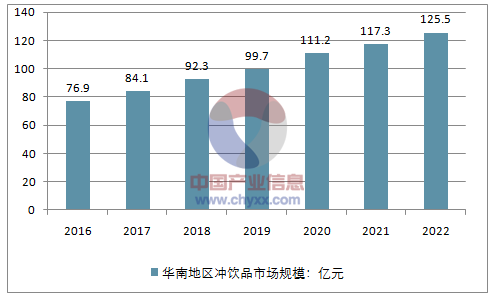 到2022年华南地区冲饮品市场规模将增长到125.5亿元。