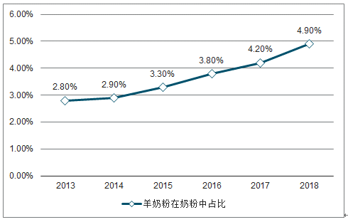 2013-2018年中国羊奶粉占比趋势(按销售额)