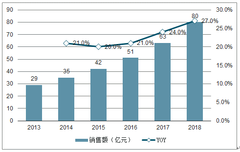 2013-2018年中国羊奶粉销售额级增速趋势(亿元)