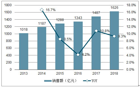 2013-2018年中国婴幼儿配方奶粉销售额及增速趋势