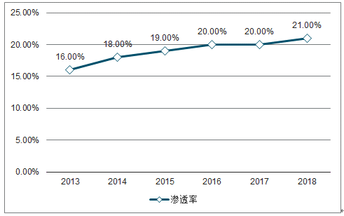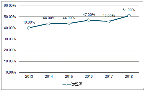 2013-2018年奶粉在1-3年龄段婴儿中的渗透率趋势