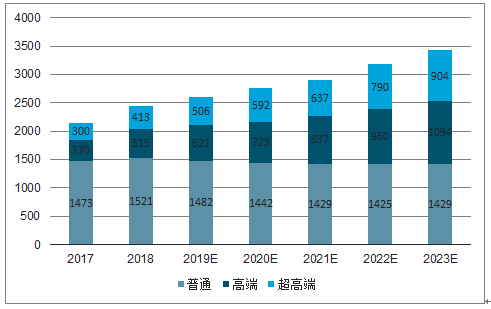 2017-2023年分定位销售规模趋势及预测(亿元)
