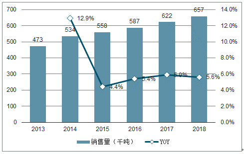 2013-2018年中国婴幼儿配方奶粉销售量及增速趋势
