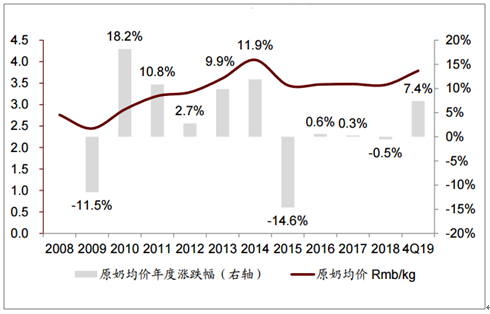 2010-2019上行周期中国内原奶价格同比涨幅